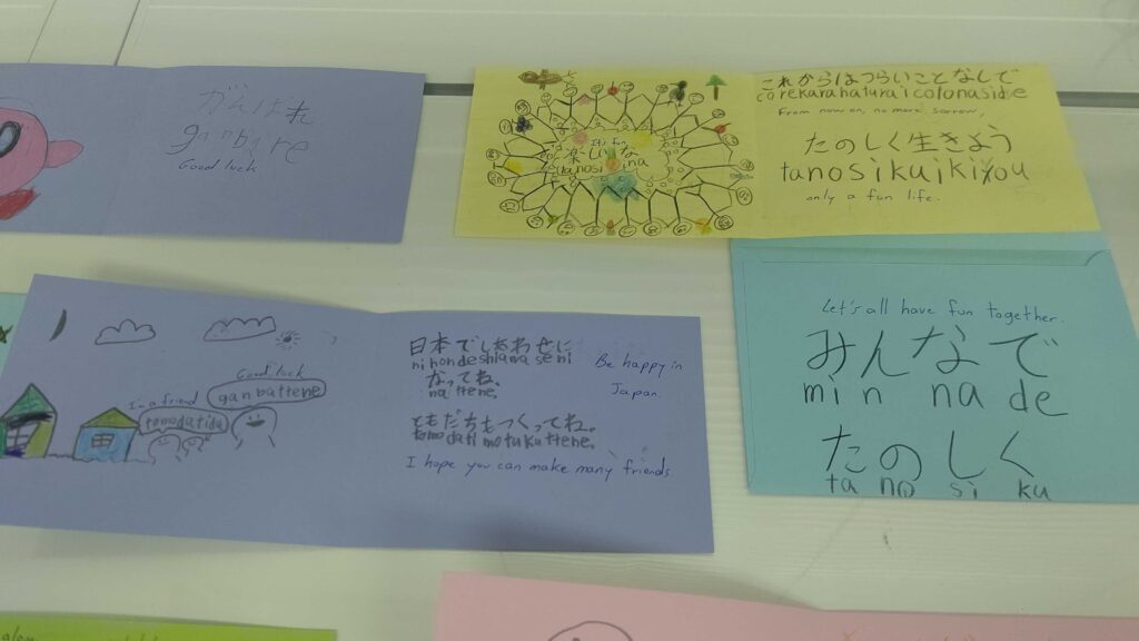 (左上写真)難民のみなさんに送る食料とともに、食料発送ボランティアから寄せられた手紙とお守り
